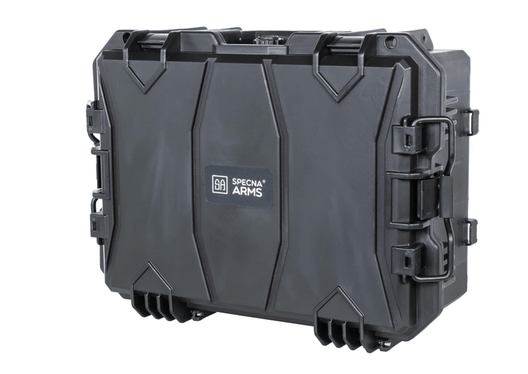 Designul tehnic include nervuri exterioare pentru stivuire sigură, o supapă de echilibrare a presiunii pentru transport aerian și găuri pentru lacăte, asigurând un plus de securitate în orice context profesional. Sigla discretă SPECNA ARMS accentuează caracterul premium al produsului.