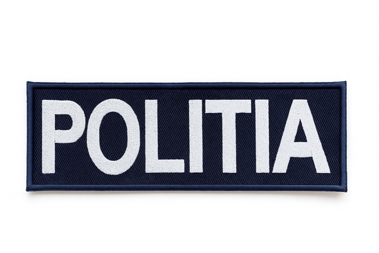 Emblema brodată POLIȚIA (model spate, dimensiune 20x8 cm) este un patch textil oficial, confecționat din materiale rezistente și broderie densă, oferind o vizibilitate ridicată datorită contrastului dintre textul alb și fondul bleumarin.
