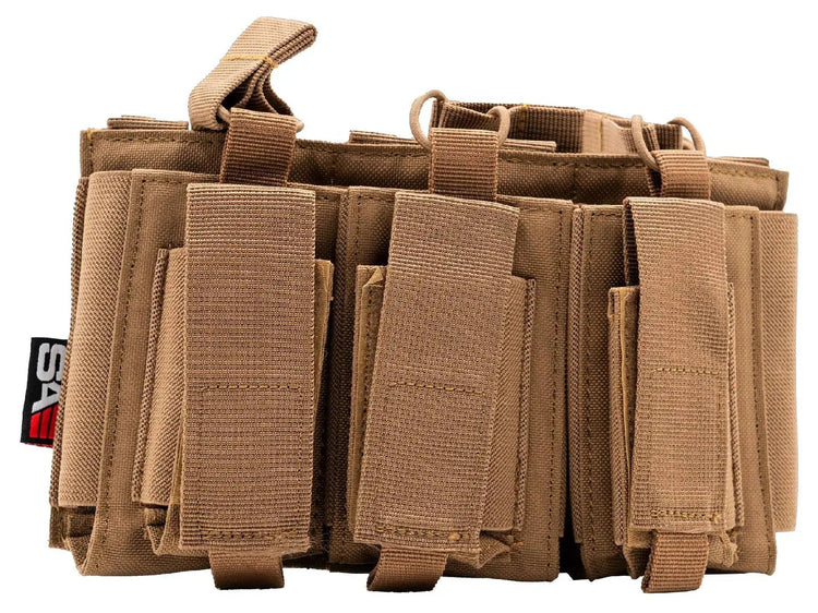 Buzunar triplu pentru incarcatoare de tip 5.56, model open top fabricat din nylon. Corzile elastice securizeaza incarcatoarele si faciliteaza extractia rapida a acestora.