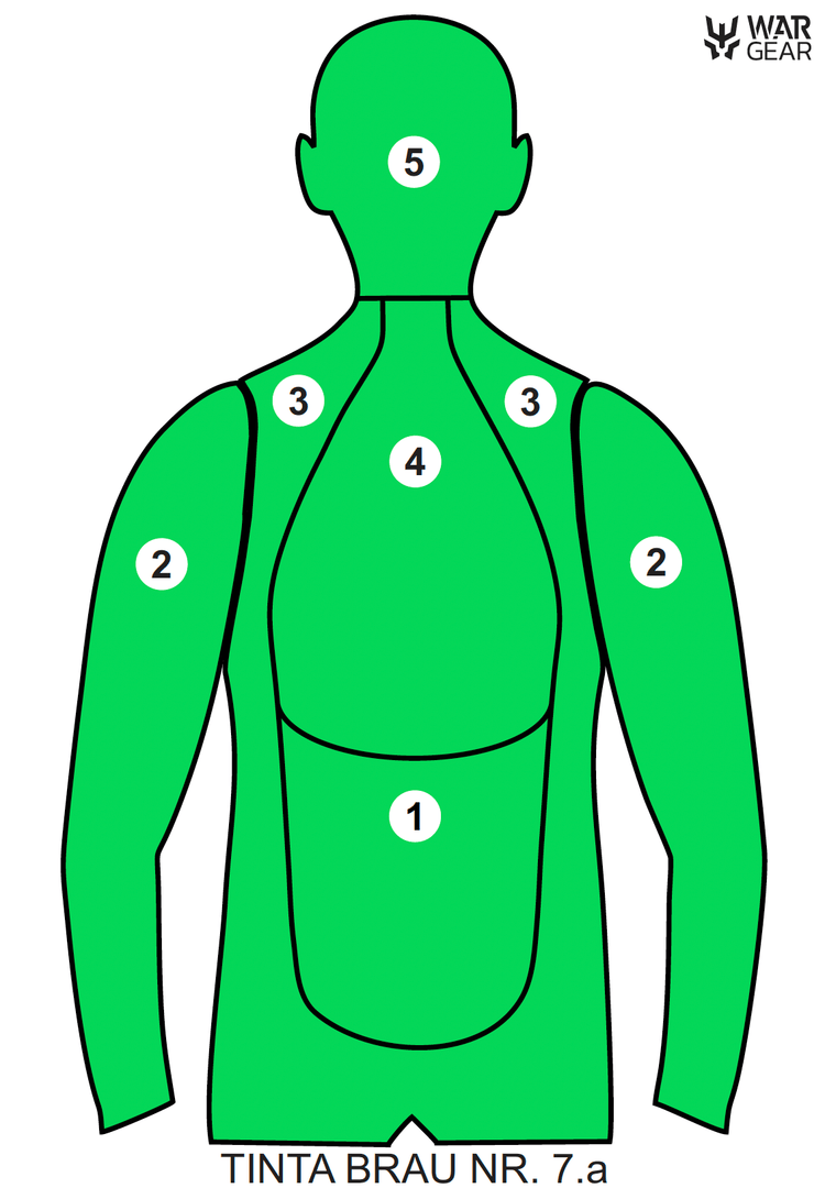Ținta Brâu nr. 7a este proiectată pentru antrenamente avansate de tragere, fiind utilizată în mod frecvent de structuri de ordine publică, unități militare și instructori specializați. Silueta umană din spate este segmentată în zone numerotate de impact (1–5), corespunzătoare unor regiuni anatomice esențiale – trunchi, torace, cap și membre superioare – permițând o evaluare realistă a preciziei și eficienței tragerii în situații tactice simulate.