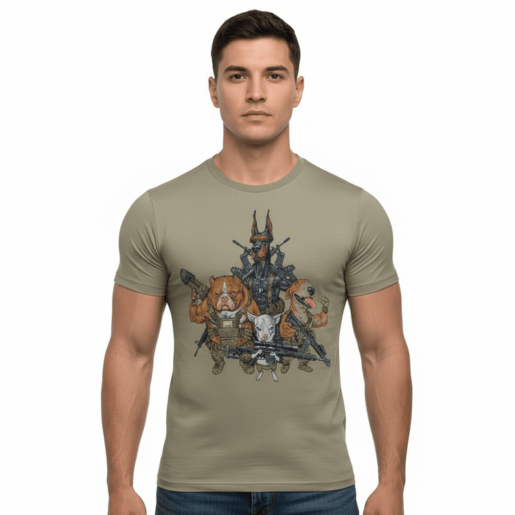 Pe partea din față a tricoului, este ilustrată o echipă tactică de patru câini înarmați, fiecare cu un caracter distinct și o atitudine hotărâtă, simbolizând o veritabilă echipă de elită. Zâmbetele cățeilor arată clar că, deși sunt plini de umor, sunt extrem de serioși când vine vorba de misiunea lor. Pe spatele tricoului, aceiași luptători sunt surprinși în acțiune, subliniind dinamica și energia unei echipe care înfruntă provocările împreună, transformând orice situație dificilă într-o aventură.